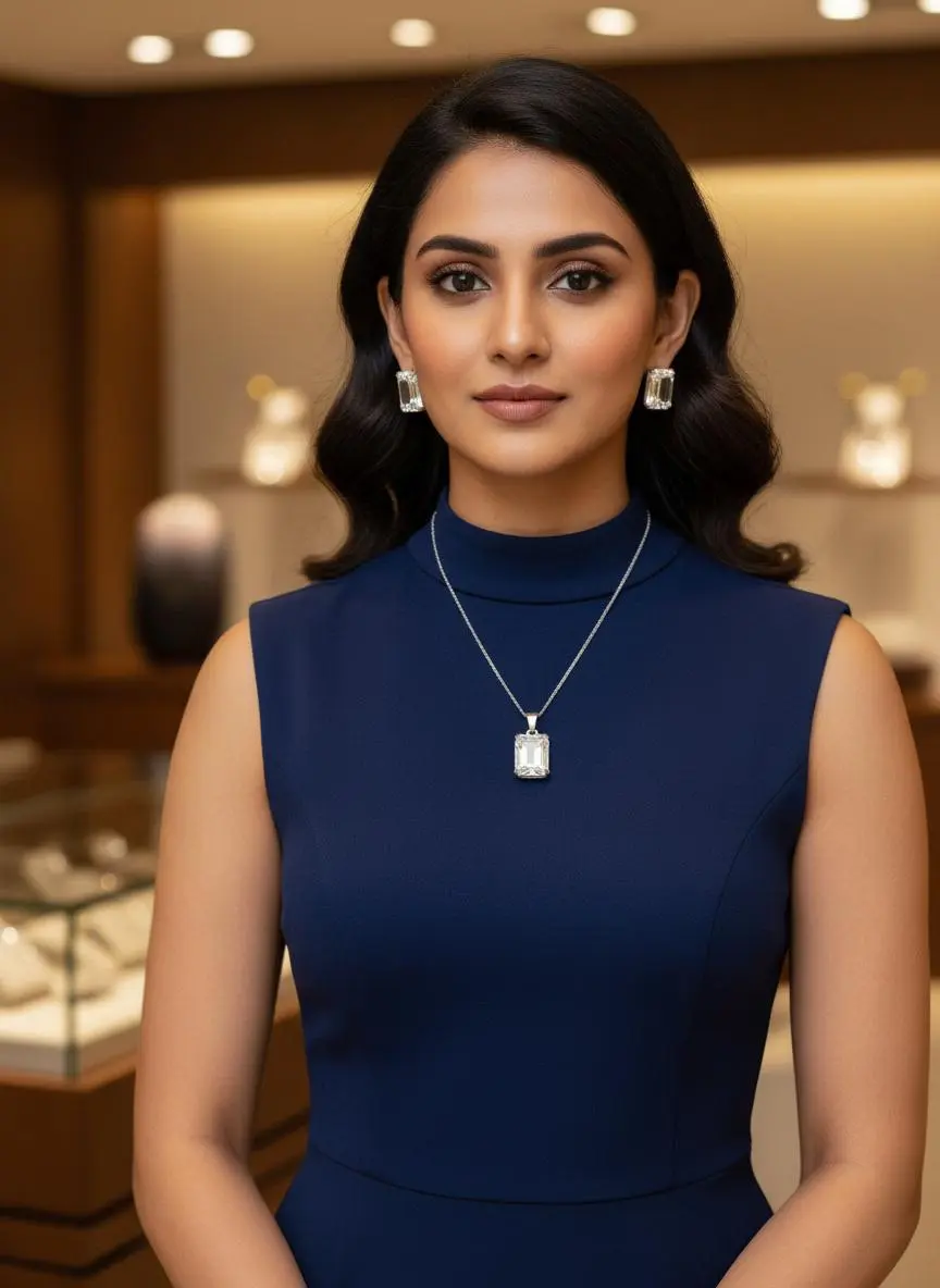 “This product is plated with white gold and contains American diamonds and glass stones. Slight color variations may occur due to photography and lighting. Avoid direct contact with water, perfumes, and chemicals to maintain shine.”